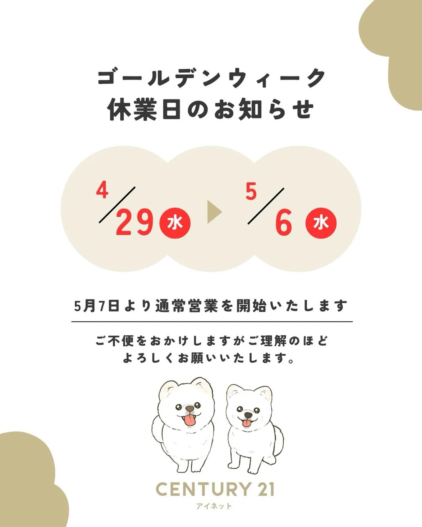 GW休業のお知らせです 🏠 2026/04/24 GW休業のお知らせです 🏠 2026年4月29日(水)〜5月6日(水) 上記期間を休業いたします。 5月7日9:00から通常営業を開始いたします。 何卒よろしくお願いいたします。 #尼崎 #不動産 #センチュリー21 #アイネット